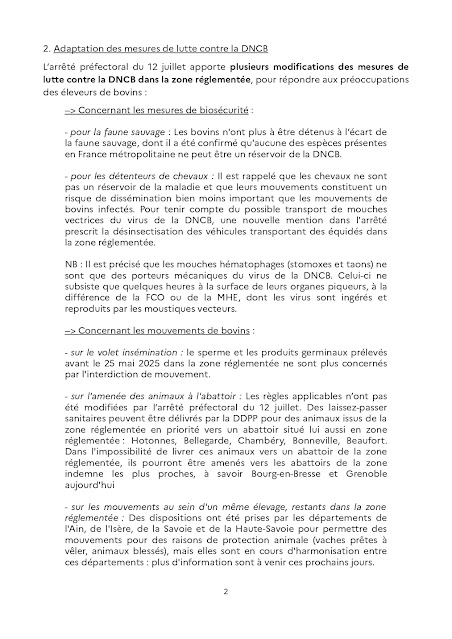 Je vous prie de bien vouloir trouver ci-joint un arrêté préfectoral déterminant une zone réglementée suite aux foyers de dermatose nodulaire contagieuse bovine (DNCB) survenus dans l’Ain, la Savoie et la Haute-Savoie